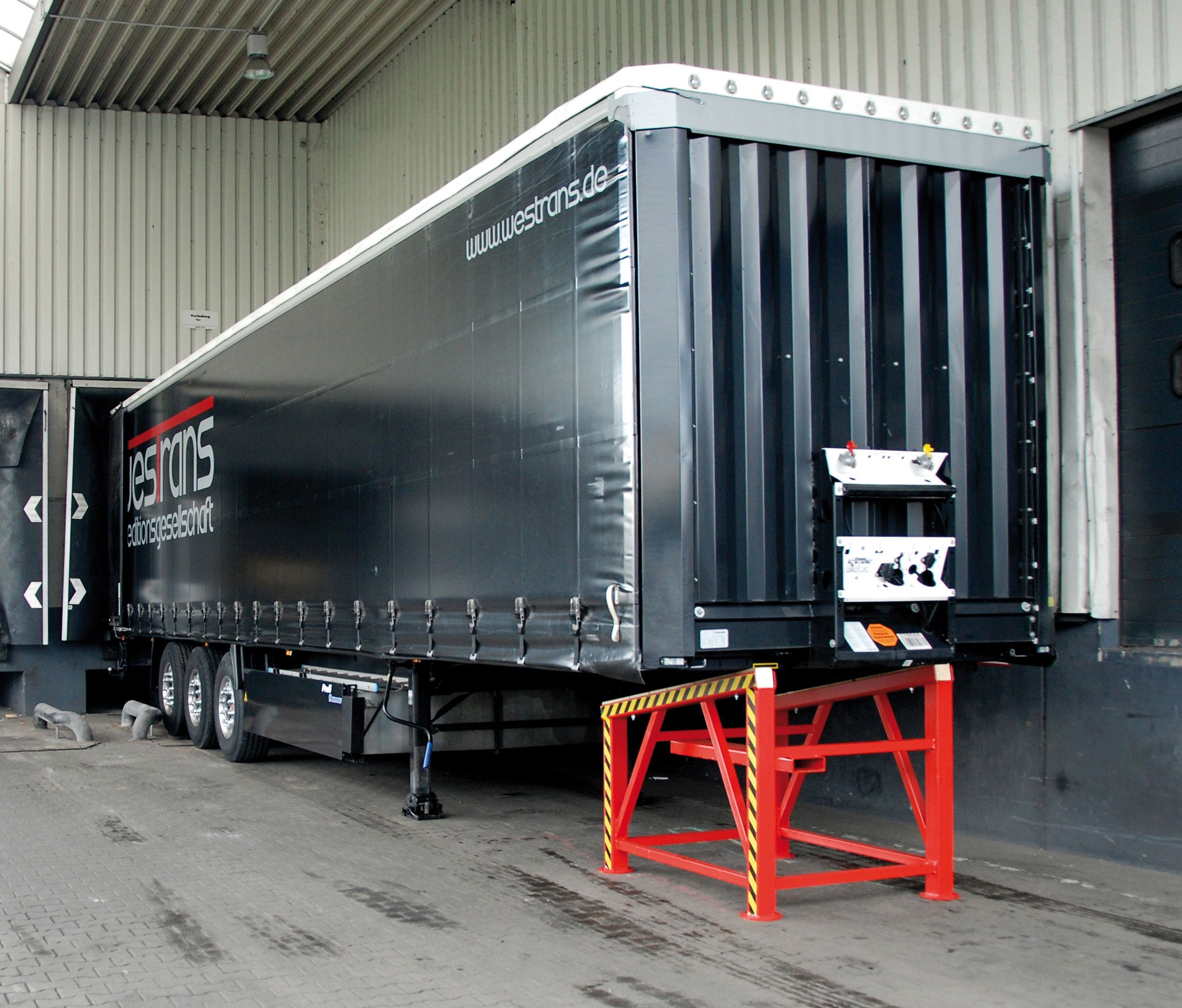 Unsere Verladestütze vom Typ VS dient für die Be- und Entladung von Sattelaufliegern bis 25 t. Sie besteht aus einer Stahlkonstruktion mit einer Einfahrtasche, die eine problemlose Aufnahme und genaue Platzierung vom Staplersitz ermöglicht. Vier Standfüße und die relativ breite Konstruktion gewährleisten eine hohe Standsicherheit. Die schräg verlaufende, rutschhemmende Auflagefläche gleicht die unterschiedlichen Unterfahrhöhen der Auflieger aus und sichert gegen Kippen und Wegrollen.