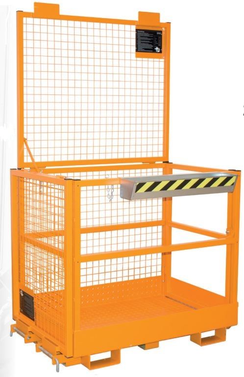 Diese Arbeitsbühne wurde speziell für Mitgänger-Flurförderzeuge entwickelt. Die automatische Sicherung, die in die Öffnung der Gabelzinke greift, bildet hier ein Alleinstellungsmerkmal, welches in Verbindung mit der Gesamtkonstruktion aus Rechteckrohr, dreiseitigen Schutzgittern, einem komplett zu öffnenden Einstiegsbereich sowie weiteren Möglichkeiten der Sicherung für Frontstapler am Markt einmalig ist.