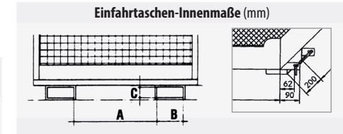 - Einfahrtaschen-Innenmaße (schmale Seite) A:190 mm B:200 mm C:80 mm