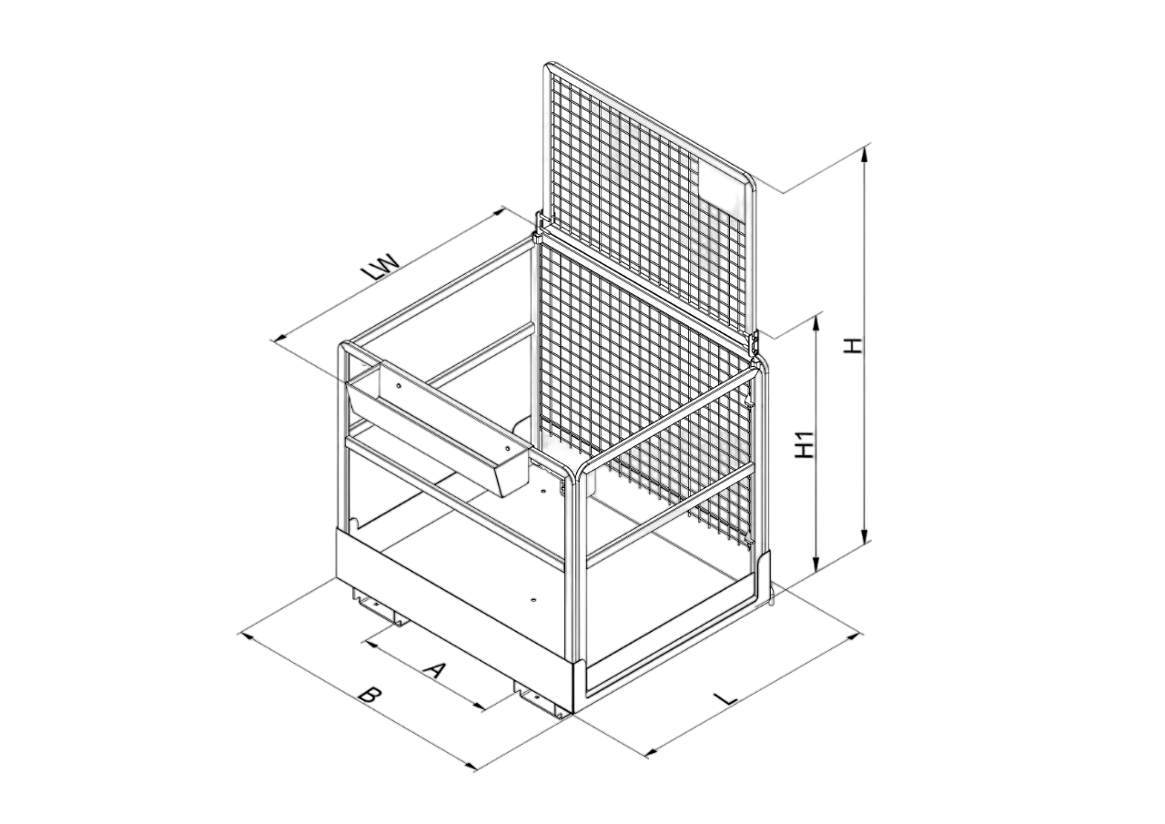 Die Arbeitsbühne für Gabelstapler Typ 1073.7 besteht aus einer stabilen Vierkant-Rohrkonstruktion. Dank der geschlossenen Bodenwanne besteht keine Gefahr, dass Gegenstände herabfallen. Die Plattform ist zudem aus rutschsicherem Material gefertigt, was die Sicherheit erhöht. Eine Werkzeugablage ist im Lieferumfang enthalten, um die Arbeit zu erleichtern. Der Zugang zur Arbeitsbühne erfolgt bequem über eine seitlich öffnende Tür.