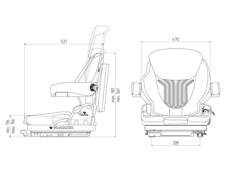 Die Abmessungen des Gabelstapler Fahrersitz von Grammer Typ MSG65/521 Primo XM betragen ohne Armlehne 47x54x58 cm (BxTxH), er verfügt über einen Federweg von 80 mm und einer Längsverstellung von 210 mm.