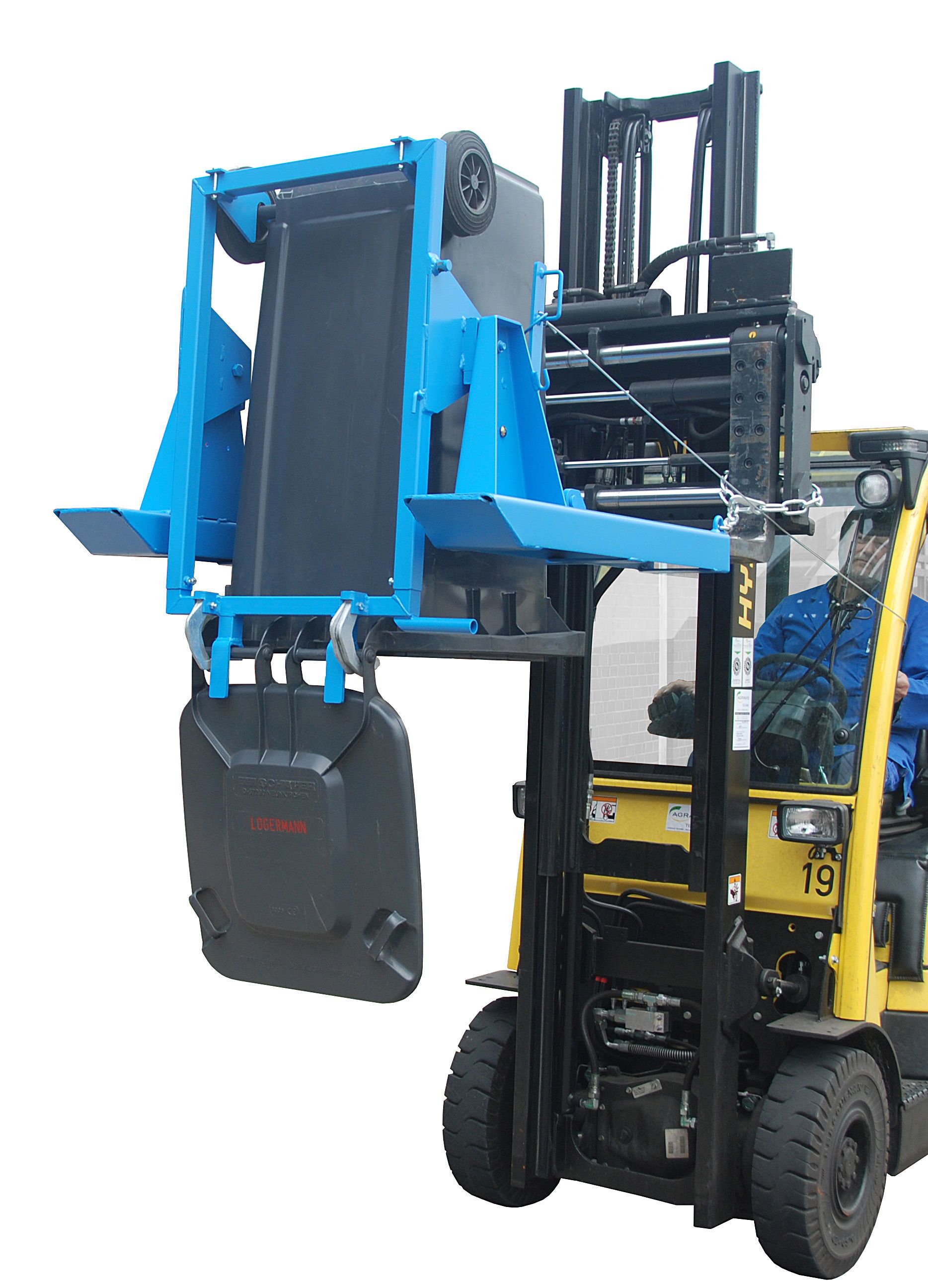 Unser Mülltonnen-Kipper vom Typ MK unterstützt bei der Entleerung und Reinigung von 80-, 120- oder 240-l-Mülltonnen. Der Kipper besteht aus einer robusten Stahlkonstruktion und besitzt Einfahrtaschen für Gabelzinken-Aufnahme. Er ist geeignet für Gabelstapler, Radler und weitere Trägerfahrzeuge mit Gabelzinken. Eine Sicherung gegen unbeabsichtigtes Abrutschen und Auskippen ist vorhanden. Zusätzlich sichern selbsttätige arretierende Haken die Mülltonne beim Abkippen.