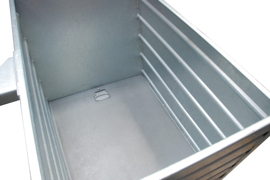 Unsere Späne-Stapelkipper der Serie BSS verzinkt für eine robuste Beanspruchung sind gefüllt 3-fach stapelbar. Sie verfügen über einen glatten Boden (3 mm ungesickt), einem Ablasshahn 1" an der Schüttwand und sind öl- und wasserdicht verschweißt. Das Auskippen erfolgt über eine Traverse (siehe Zubehör) per Seilzug ganz bequem vom Staplersitz aus.
