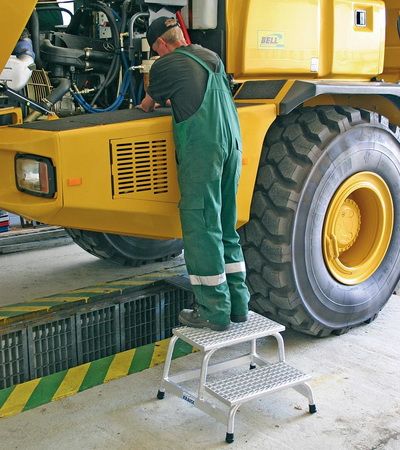 Unser Stabilo Montagetritt mit Gitterroststufen kommt besonders in feuchten oder öligen Arbeitsumgebungen zum Einsatz und bietet die Möglichkeit Arbeiten in erhöhten Positionen ergonomisch auszuführen.