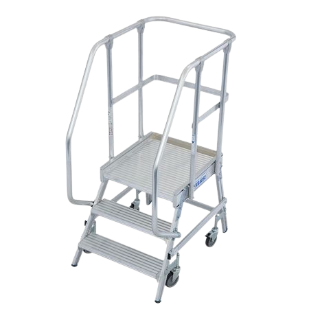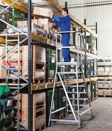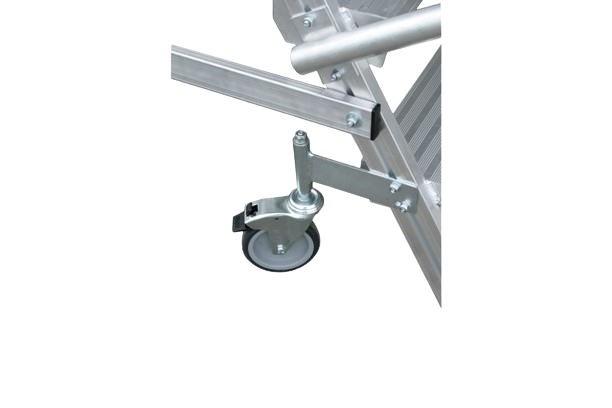 Die Leister versteht sich inklusive vier Lenkrollen zum leichten Verfahren, wovon zwei Lenkrollen festgestellt werden können, um einen sicheren Stand zu bieten. Zusätzlich verfügt die Leiter über vier starre Fußenden, welche mit bodenschonenden Fußkappen ausgestattet sind.