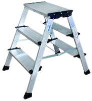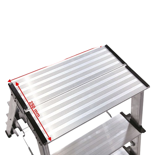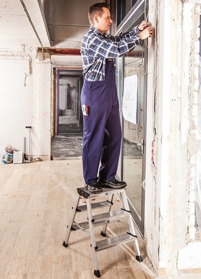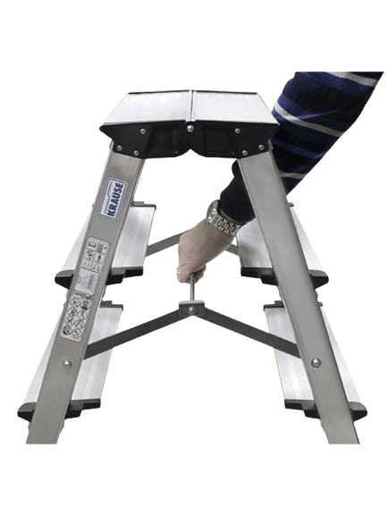Unser Treppo Doppel-Klapptritt ist ein nützlicher Arbeitshelfer im Alltag und besonders gut geeignet, um Montagearbeiten in höher gelegenen Positionen auszuführen. Immer dort, wo die eigene Körpergröße nicht mehr ausreichend ist, kommt dieser Premium-Klapptritt zum Einsatz. Der Doppel-Klapptritt ist in zwei unterschiedlichen Varianten, drei- oder vierstufig, erhältlich. Eine Steiganwendung bis 2,65 m kann mit der dreistufigen Trittvariante erreicht werden. Die vierstufige Variante bietet eine Steiganwendung bis 2,85 m. Die Anzahl der Stufen sind bei jedem Tritt beidseitig vorhanden. Alle Modelle sind Alufarben und verfügen über ein geringes Eigengewicht von 4,8 kg oder 6,2 kg. Durch seine einhändig bedienbare Multifunktions-Klappsperre bietet er dem Benutzer einen besonders sicheren Stand und eine optimal schnelle und leichte Handhabung.